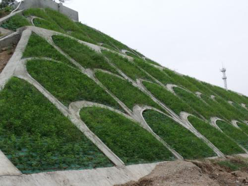 邊坡的植被覆蓋率達到30%以上時,能承受小雨的沖刷,覆蓋率達80%以上時能承受暴雨的沖刷。待植物生長茂盛時,能抵抗沖刷的徑流流速達6m/s,為一般草皮的2倍多。土工網(wǎng)的存在,對減少邊坡土壤的水分蒸發(fā),增加入滲量有良好的作用。同時,由于土工網(wǎng)材料為黑色的聚乙烯,具有吸熱保溫的作用,可促進種子發(fā)芽,有利于植物生長。四是快速防護措施⑴當工期與植被培植期發(fā)生矛盾,在工程剛竣工即進入暴雨季節(jié)時,需采取“加筋草皮”對工程進行快速防護,以便竣工后即可得到全面覆蓋的防沖刷植被。“加筋草皮”采用三維植被網(wǎng)在草坪種植場或工地附近的空地上預(yù)先培植好草皮,成坪后即可整卷或分塊卷起,然后鋪設(shè)至需防護的邊坡上。⑵在難以治理的干旱地區(qū),可使用土壤凝結(jié)劑,把選擇好的適合的草籽,經(jīng)過特殊處理后,與土壤凝結(jié)劑拌和噴灑(也可以先播草籽,而后再施用土壤凝結(jié)劑)。經(jīng)土壤凝結(jié)劑處理后的坡面,草籽和土壤不會因風(fēng)吹雨淋而流失,同時凝結(jié)劑又降低了土壤中水分的蒸發(fā),在一定程度上保證了草籽的水分供應(yīng),大大提高草籽的成活率。