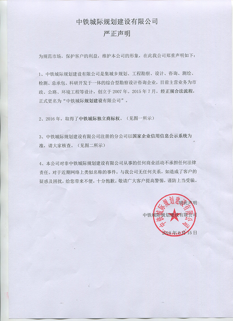 中鐵城際規(guī)劃建設(shè)有限公司 嚴正聲明