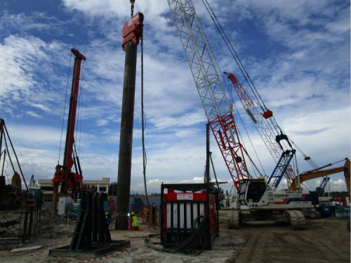 (4)選用的振動錘功率要合適。鋼筋籠下放到距孔口1~2m時,要靠帶護筒的振動錘下送到設計標高,一般樁徑400mm、樁長不超過10m的樁,選用1.8kW的振動錘即可滿足要求;600mm樁徑、樁長小于15m的基樁,選用2.2kW的振動錘為宜;