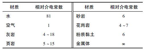 根據(jù)材料的相對介電常數(shù),由式( 2) 可計算出電磁波在該介質(zhì)中的傳播速度,從而可以根據(jù)反射波的接收時間判斷出反射體的位置。