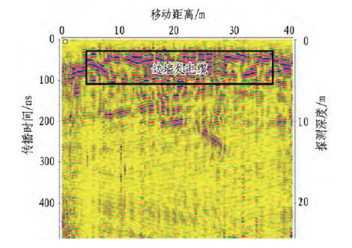 隧道內(nèi)電纜對地質(zhì)雷達探測干擾較大,容易造成誤判。電纜通常布置在隧道邊墻,在進行底板下方不良地質(zhì)體探測時,測線方向與電流方向平行,天線的極化方向垂直于電流方向,如圖4 所示,其在地質(zhì)雷達圖像上表現(xiàn)為1 組反射強烈的水平同相軸[14]。在底板探測時,需要注意輸電線路與測線之間的相對位置,并記錄下來。
