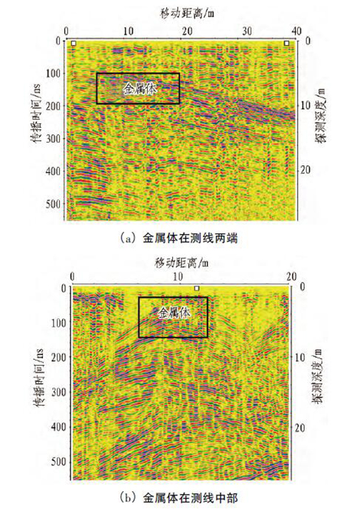 在進行底板探測時,測線附近通常放置有金屬體( 如臺車、裝載機、電機等) ,會對探測結(jié)果產(chǎn)生干擾。當金屬體位于測線兩端時,其在雷達圖像上反映為雙曲線的一翼,如圖7( a) 所示; 當金屬體位于測線中間時,其在雷達圖像上反映為雙曲線,如圖7 ( b) 所示。由于雙曲線通常為溶洞在雷達圖像上的反射特征,為防止將金屬體誤判為溶洞等異常體,探測前需撤走測線附近的金屬體。