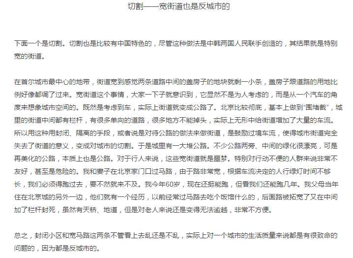 標(biāo)題上看,談的城市設(shè)計(jì),其實(shí)更多是針對城市問題,之所以起個(gè)標(biāo)題叫城市設(shè)計(jì),其實(shí)是旨在能進(jìn)入城市設(shè)計(jì)領(lǐng)域有所建樹,這個(gè)無可厚非,這樣標(biāo)題必定能引來建筑從業(yè)人員的共鳴,來實(shí)現(xiàn)從業(yè)領(lǐng)域的拓展。然,文我也略微仔細(xì)的讀了一下,談了蠻多觀點(diǎn)。要么都是老生常談