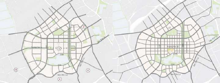 且不說標(biāo)題的錯(cuò)誤,街道和道路本來就是兩個(gè)意思,而其實(shí)他想表達(dá)的意思是道路。切割城市的道路也要看區(qū)域,看尺度,一味否定絕對不是正確的觀點(diǎn)。而這樣的思考,多少年前,城市設(shè)計(jì)的實(shí)踐領(lǐng)域也早已出現(xiàn)。何況道路和人其實(shí)不是對立的(下圖來自[SOM][2008]武漢王家墩商務(wù)核心區(qū)設(shè)計(jì)規(guī)劃方案,比較城市設(shè)計(jì)前后的路網(wǎng)密度)