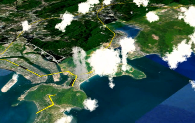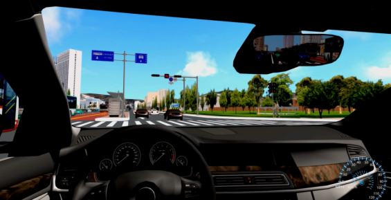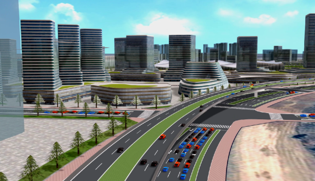 最后,在3DScene中加載3DRoad中導出的三維場景數據包,加載雨、雪、水面、云、光照等渲染特效以及仿真車流,以第一、第三人稱視角進行場景瀏覽,也可以將場景輸出為圖片和視頻。