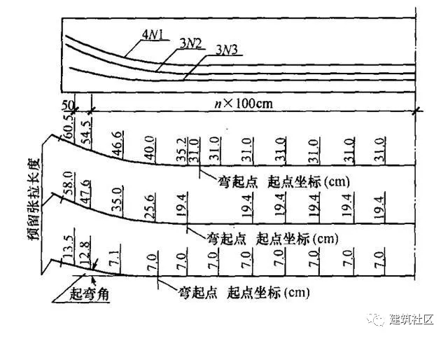 (5)對(duì)彎起的預(yù)應(yīng)力鋼筋應(yīng)列表或直接在預(yù)應(yīng)力鋼筋大樣圖中,標(biāo)出彎起角度、彎曲半徑切點(diǎn)的坐標(biāo)(包括縱彎或既縱彎又平彎的鋼筋)及預(yù)留的張拉長(zhǎng)度(圖2-47)。