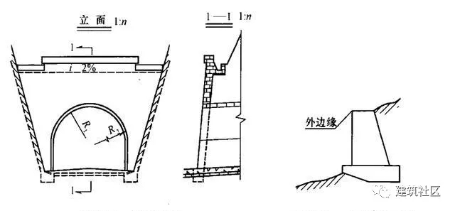 彎擋土墻在立面圖中的長(zhǎng)度,應(yīng)按擋土墻頂面外邊緣線的展開長(zhǎng)度標(biāo)注(圖2-67)。
