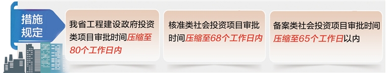 根據(jù)《若干措施》規(guī)定,河北省工程建設(shè)政府投資類項目審批時間壓縮至80個工作日內(nèi),核準類社會投資項目審批時間壓縮至68個工作日內(nèi),備案類社會投資項目審批時間壓縮至65個工作日以內(nèi)。