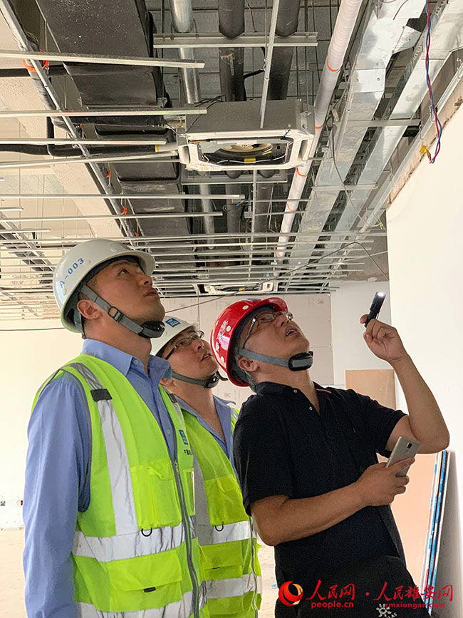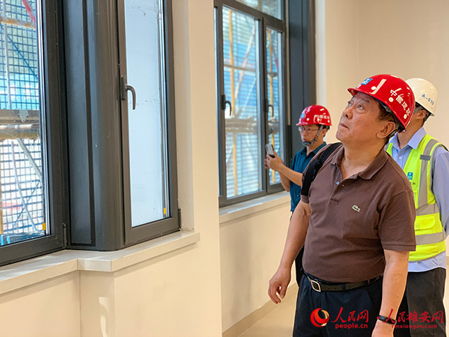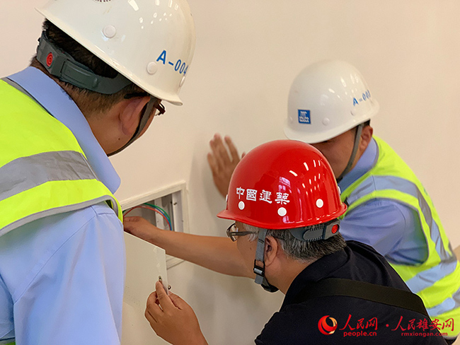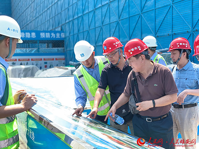 專家團(tuán)隊(duì)在雄縣三中項(xiàng)目施工現(xiàn)場(chǎng)查看施工效果圖。張婭喃攝