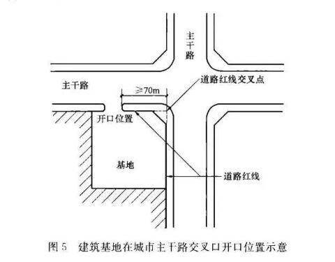 中等城市、大城市的主干路交叉口,自道路紅線(xiàn)交叉點(diǎn)起沿線(xiàn)70.0m范圍內(nèi)不應(yīng)設(shè)置機(jī)動(dòng)車(chē)出入口。