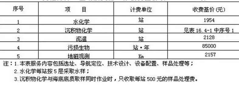 在《工程勘察收費標準》里,除了看2.3節里的“水域測量”部分外,還需要關注第16部分的“海洋工程勘察”部分,該部分對多波束海底地形測量,海底面狀況掃側,底質取樣,氣象、潮位、波浪觀測,海流、鹽度、泥沙觀測,海洋工程地質鉆探,海底地層測量,及其他海洋工程勘察項目,等等都作出了勘察收費依據。這里,海底面狀況掃側是指掃海測量,海底地層測量可以對應淺地層剖面測量。而海底地層測量又細分聲學地層探測、單道地震探測及多道地質探測三類。在其他海洋工程勘察項目部分中,地磁觀測可以與海洋磁力測量對應,另外還包括沉積物化學、污損生物、水化學等內容。