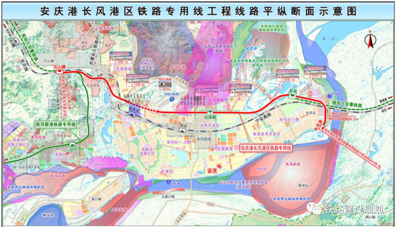 長風(fēng)港區(qū)鐵路專用線主要承擔(dān)長風(fēng)港區(qū)鐵水聯(lián)運(yùn)以及臨港企業(yè)的運(yùn)輸任務(wù),是全國十二個(gè)鐵水聯(lián)運(yùn)示范項(xiàng)目之一。項(xiàng)目位于安徽省安慶市懷寧縣、宜秀區(qū)、大觀區(qū)、迎江區(qū)境內(nèi),線路自合九鐵路安慶線新設(shè)月山鎮(zhèn)站引出,向東沿城市規(guī)劃預(yù)留鐵路廊道經(jīng)宜秀區(qū)、大觀區(qū)、迎江區(qū),終至長風(fēng)港區(qū),通過合九鐵路、安慶線與國鐵路網(wǎng)聯(lián)通。正線全長34.36公里,設(shè)月山鎮(zhèn)站、長風(fēng)港站2座車站。建設(shè)工期2年。工程為新建國鐵Ⅳ級(jí)單線內(nèi)燃鐵路專用線,設(shè)計(jì)時(shí)速80km/h,設(shè)車站2座,設(shè)橋梁4座/13.706km、隧道1座/3.855km,橋隧比約60.9%。