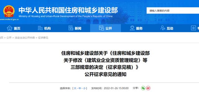 為落實(shí)建設(shè)工程企業(yè)資質(zhì)管理制度改革要求,住房和城鄉(xiāng)建設(shè)部擬修改《建筑業(yè)企業(yè)資質(zhì)管理規(guī)定》《工程監(jiān)理企業(yè)資質(zhì)管理規(guī)定》《建設(shè)工程勘察設(shè)計(jì)資質(zhì)管理規(guī)定》,起草了《住房和城鄉(xiāng)建設(shè)部關(guān)于修改〈建筑業(yè)企業(yè)資質(zhì)管理規(guī)定〉等三部規(guī)章的決定(征求意見(jiàn)稿)》,現(xiàn)向社會(huì)公開(kāi)征求意見(jiàn)。公眾可通過(guò)以下途徑和方式提出反饋意見(jiàn):