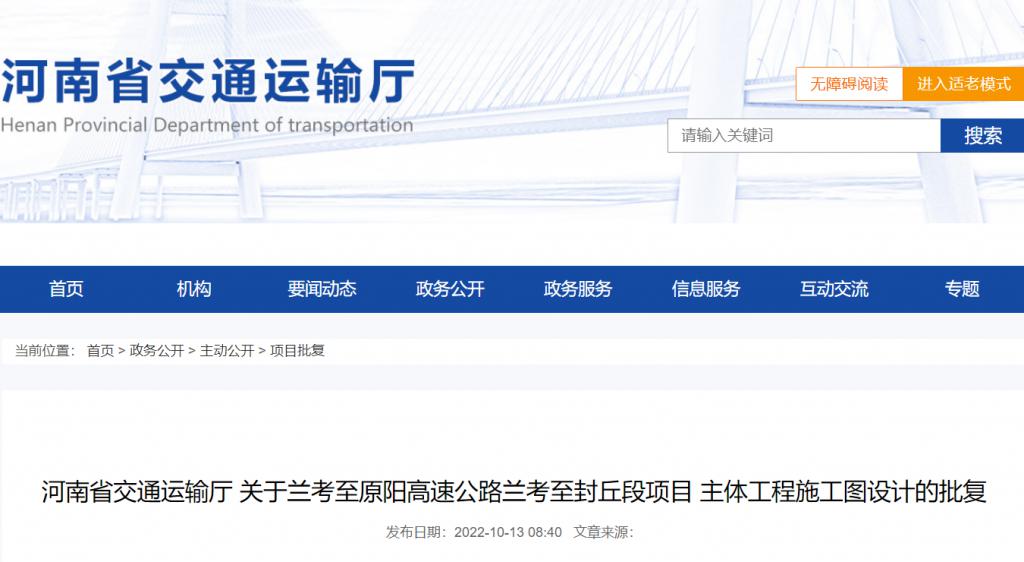 10 月 13 日,河南省交通運輸廳官方網站發布《關于蘭考至原陽高速公路蘭考至封丘段項目主體工程施工圖設計》的批復。