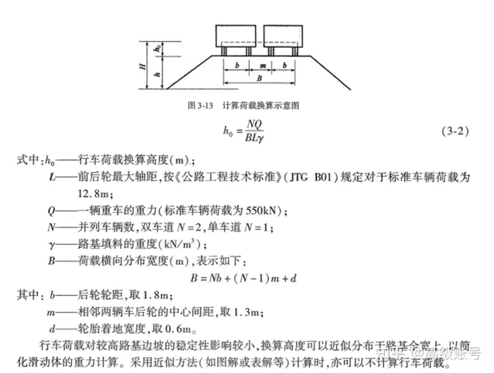 在《公路路基設(shè)計(jì)規(guī)范》(JTG D30-2015)中沒有發(fā)現(xiàn)對(duì)邊坡穩(wěn)定計(jì)算時(shí)行車荷載如何考慮的條文,但是在《路基路面工程》(黃曉明版)和《公路軟土地基路堤設(shè)計(jì)與施工技術(shù)細(xì)則》(JTG/T D31-02-2013)中有相關(guān)表述。《公路軟土地基路堤設(shè)計(jì)與施工技術(shù)細(xì)則》4.1.4-4.1.6條的規(guī)定如下,即將行車荷載換算成土柱高度,可按車輛荷載均布于車輛投影面積上換算得出。