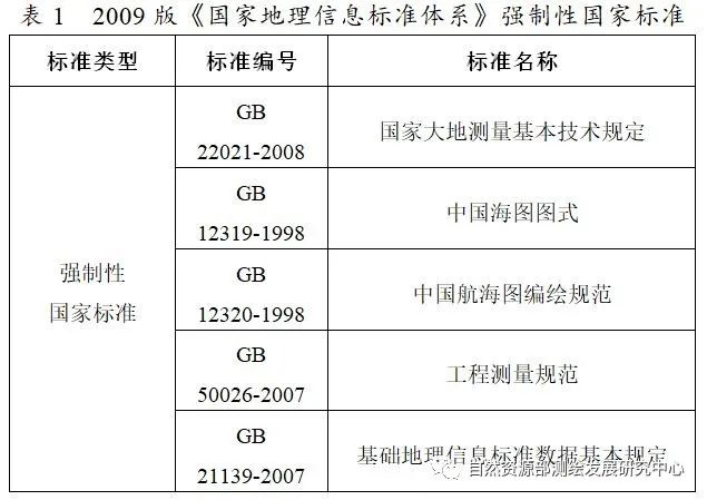 2009年原國家測繪局頒布實施了《國家地理信息標準體系》,該標準體系由地理信息基礎類標準、支持專業類標準以及專項類標準三層組成,分為通用類、數據資源類、應用服務類、環境與工具類、管理類、專業類和專項類共7大類、44小類。截至該體系頒布,收錄標準211項,其中強制性標準僅5項(見表1)。5項強制性國家標準涵蓋大地測量、海洋測繪、工程測量等方面,一定程度上保障了國家安全以及人民生命安全,但缺少人民財產安全相關的強制性國家標準。