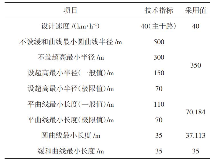 平面設計綜合考慮與老路平面順接、道路等級要 求、橋梁位置要求。設計范 圍 為 K0-055 ~K0+447,路線全長 502 m,其中橋梁段長度約 60 m,位于直線段上,道路段長度約 442 m。平面線形標準及設計采用值見表 1[2]
