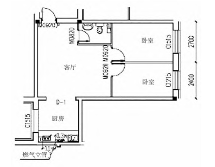 在室內鋪設燃氣管線時,必須注意:①不能鋪設在潮濕或含有腐蝕性介質的房間,也不能將其引入臥室,特別是在臥室、浴室或衛生間里;②嚴禁通過易燃、爆炸物品、配電間、變電所、煙、風道等場所;③橫穿臥房、衛生間或地下室的管道,應在套管內安裝焊接;④如需放置于潮濕或有腐蝕性介質的室內,則應采用防腐蝕措施;⑤管道穿越樓板、樓梯平臺、墻壁、隔墻時,應將管線置于套管內。⑥安裝燃氣灶的房間凈高不宜低于2.2米,安裝熱水器的房間應該宜大于2.4米。如圖3所示,室內廚房豎管的設計。