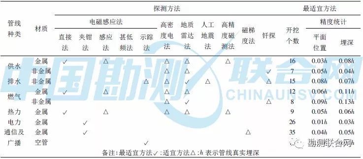 1) 各種管線類型最適宜探測方法的精度均能達(dá)到規(guī)范。
