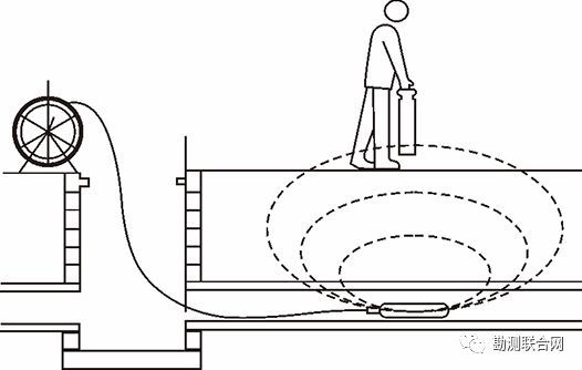 5) 示蹤法:借助示蹤裝置,使其沿非金屬管道發(fā)射電磁信號,然后使用接收裝置在地面追蹤信號,以探測非金屬管道的一種探測方法[4]。