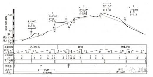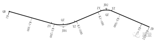 在路線平面圖中,轉(zhuǎn)折處應(yīng)注寫交點代號并依次編號,如JD2 表示第2個交點。還要注出曲線段的起點ZY(直圓點)、中點Qz(曲中點)、終點YZ(圓直點)的位置。為了將路線上各段平曲線的幾何要素值表示清楚,一般還應(yīng)在圖中的適當位置列出平曲線要素表。如果設(shè)置緩和曲線,則將緩和曲線與前、后段直線的切點分別標記為ZH(直緩點)和HZ(緩直點);將圓曲線與前、后段緩和曲線的切點分別標記為HY(緩圓點)和YH(圓緩點)。