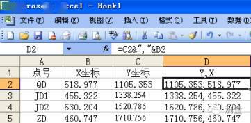 在實際工作中路線導(dǎo)線的坐標數(shù)據(jù)都是用Excel 表格存放。這樣簡化了在繪圖時輸入坐標的麻煩,在Excel表格中編輯導(dǎo)線點坐標對,如圖11-2 所示,選中D2 欄,輸入公式“C2&" ,"&B2”,按回車鍵,系統(tǒng)自動生成了所需要的坐標對。選中 D2欄,將光標指向第二欄右下角,系統(tǒng)出現(xiàn)黑色小十字標記,按住鼠標左鍵向下拖動十字標記,一直到ZD,D2欄就自動生成了對調(diào)后的各交點的坐標對,并將他們依次復(fù)制下來。