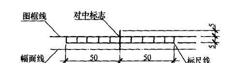 (2)需要縮微后存檔或復(fù)制的圖紙,圖框四邊均應(yīng)具有位于圖幅長(zhǎng)邊,短邊重點(diǎn)的對(duì)中標(biāo)志(圖2-1),并應(yīng)在下圖框線的外側(cè),繪制一段長(zhǎng)100cmm標(biāo)尺,其分隔為10mm。對(duì)中標(biāo)志的線寬宜采用大于或等于0.5mm,標(biāo)尺線的線寬宜采用0.25mm的實(shí)線繪制(圖2-2)