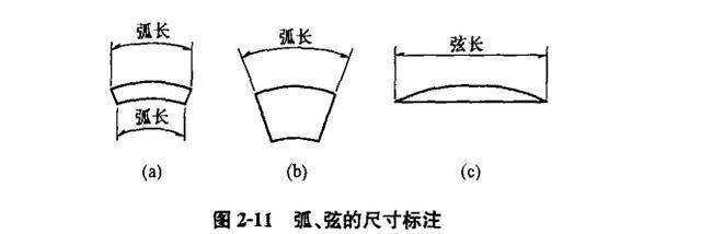 (9)圓弧尺寸宜按圖2-11(a)標(biāo)注。當(dāng)弧長(zhǎng)分為數(shù)段標(biāo)注時(shí),尺寸界線也可沿徑向引出,見(jiàn)圖2-11(b)。弦長(zhǎng)的尺寸界線應(yīng)垂直圓弧的弦,見(jiàn)圖2-11(c),