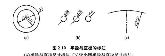 (8)半徑與直徑可按圖2-10(a)標(biāo)注。當(dāng)圓的直徑較小時(shí),半徑與直徑可按圖2-10(b)標(biāo)注;當(dāng)圓的直徑較大時(shí),半徑尺寸的起點(diǎn)可不從圓心開(kāi)始,見(jiàn)圖2-10(c)0半徑和直徑的尺寸數(shù)字前,應(yīng)標(biāo)注“r(R)”或“d(D)",見(jiàn)圖2-10(b).