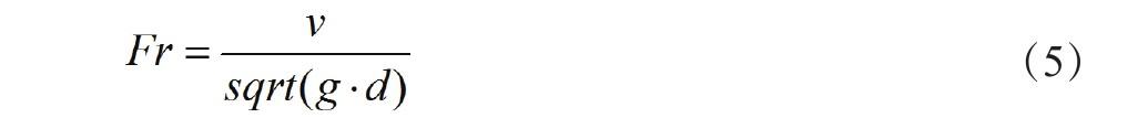 (2)確定管道尺寸。根據(jù)最大流量和施工要求,確定排水管道的直徑或斷面形狀[8]。在確定管道尺寸時(shí),需要考慮管道自清潔速度、懸沙能力和維護(hù)性等因素。管道的自清潔速度是指在正常流量下,管道內(nèi)部能夠?qū)⒎e聚的污物、雜物和沙粒沖刷走的速度,采用Froude數(shù)可判定管道自清潔度,其計(jì)算公式見(jiàn)式(5)。