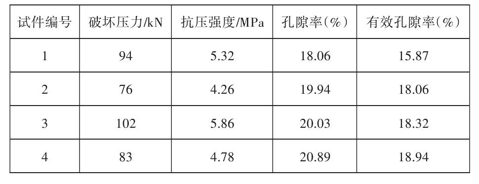 同時,水灰比W/C指標(biāo)需要按照集料級配設(shè)計結(jié)果具體確定,并基于工程實(shí)際情況通過室內(nèi)試驗進(jìn)行優(yōu)化。本項目集料選用花崗巖,采用室內(nèi)試驗進(jìn)行分析,以水灰比W/C=0.4的標(biāo)準(zhǔn)制作4組試件,并分別開展試驗,所得結(jié)果如表2所示。