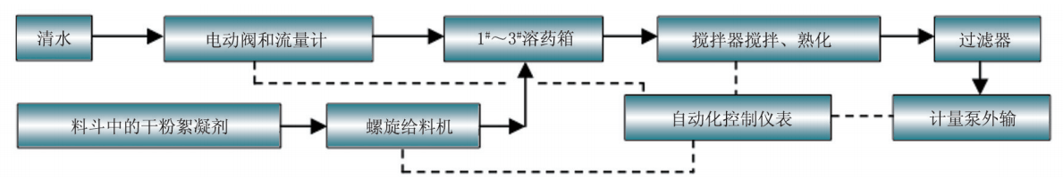 在污水處理系統中,為了除去或降低水中懸浮物,使其產生大顆粒的凝聚體,加快水中雜質和污泥沉降速度,一般在污水處理的沉降部分加入一定濃度的絮凝劑。用于含油污水處理的絮凝劑包括無機絮凝劑、有機絮凝劑和復合絮凝劑 3 大類。為了保證加藥濃度、減輕工人勞動強度和降低藥劑成本,應用絮凝劑自動加藥工藝技術。