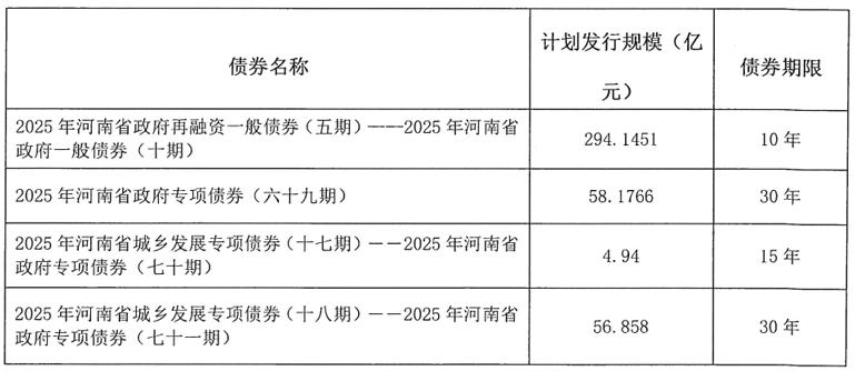 2025年河南省政府一般債券(十期)擬發行金額294.1451億元,用于償還2018年河南省政府一般債券(六期)、2020年河南省政府再融資一般債券(四期)-2020年河南省政府一般債券(七期)等債券本金。